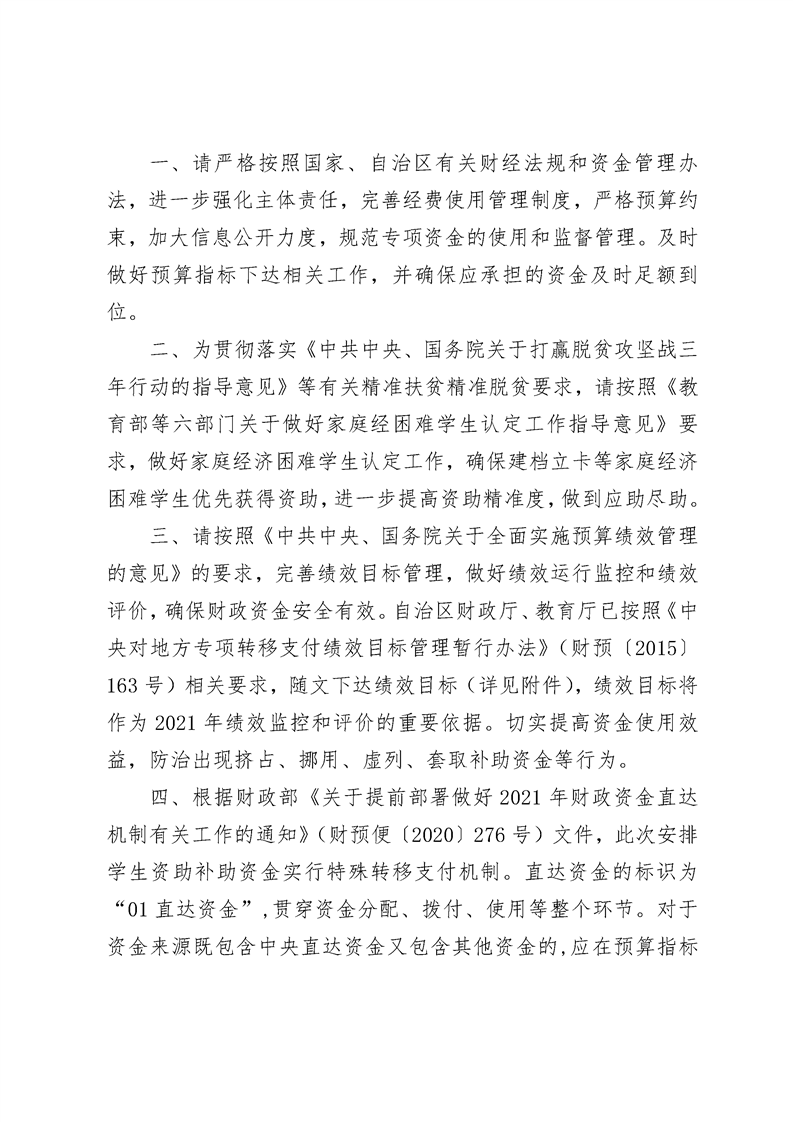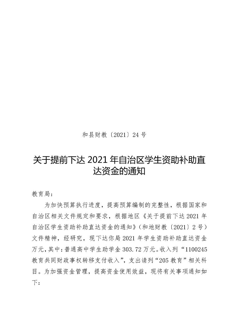 和县财教[2021]24号关于提前下达2021年自治区学生资助补助直达资金的通知